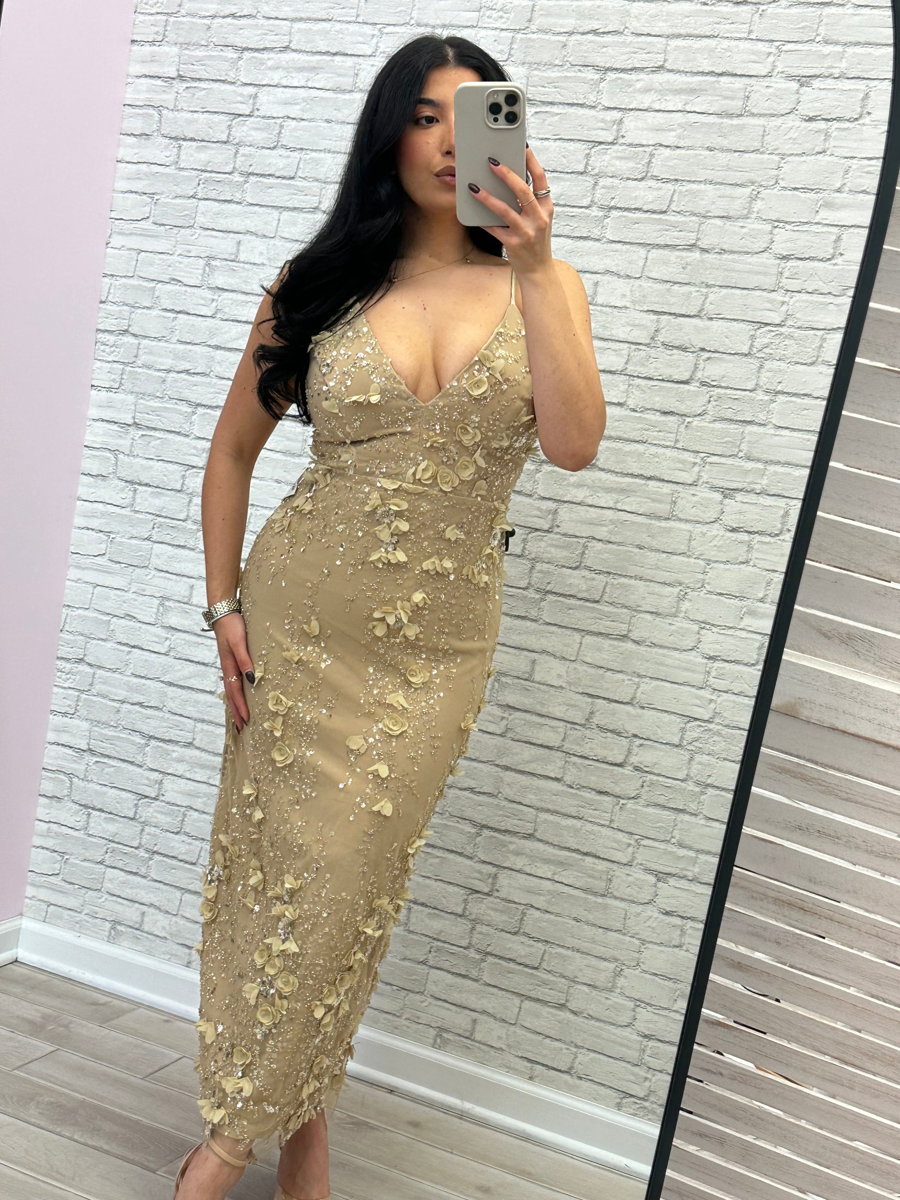 This sequined maxi dress combines timeless elegance with striking details. Intricate floral appliqué, beadwork, and sequins create luminous dimension across the silhouette, while a sheer overlay adds graceful movement. The deep neckline offers a tasteful touch, making this piece ideal for memorable evenings.