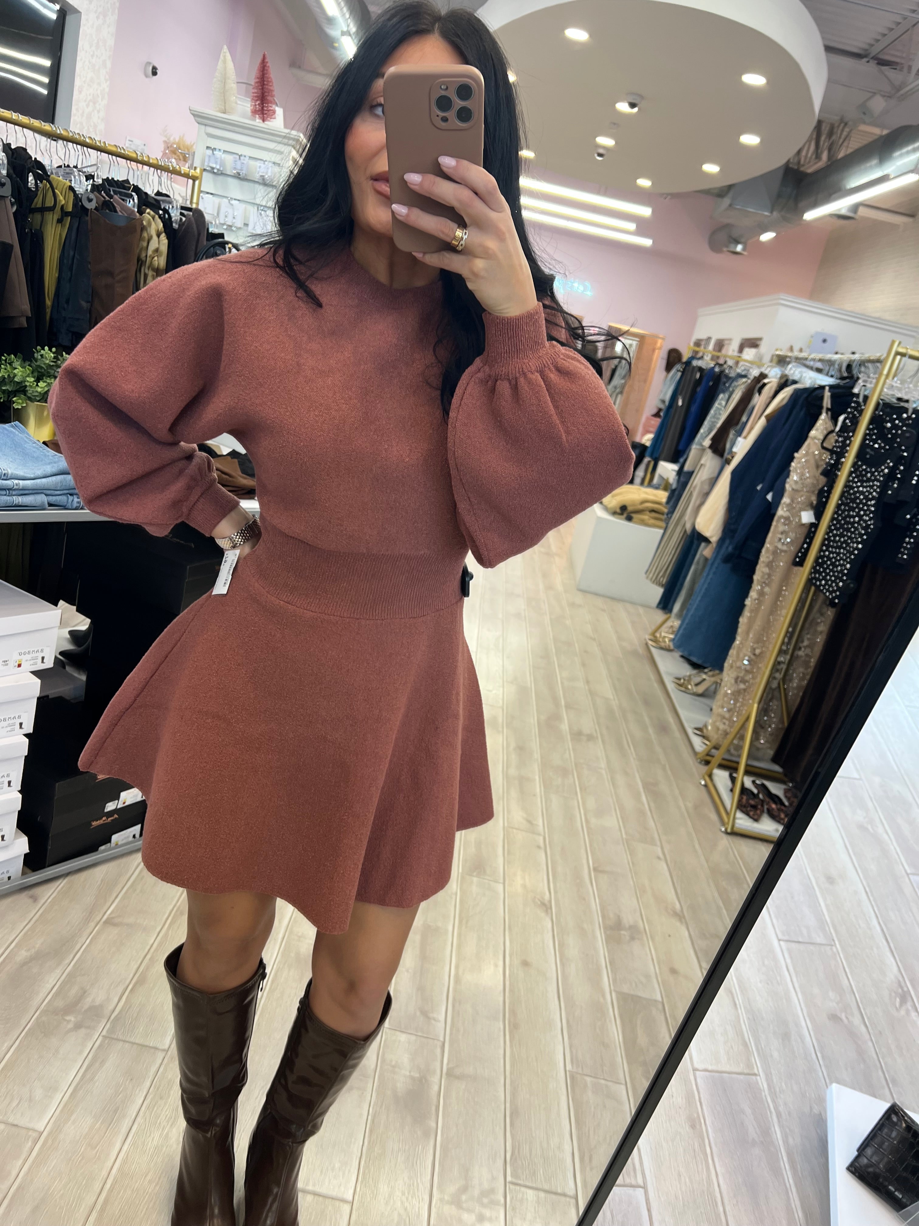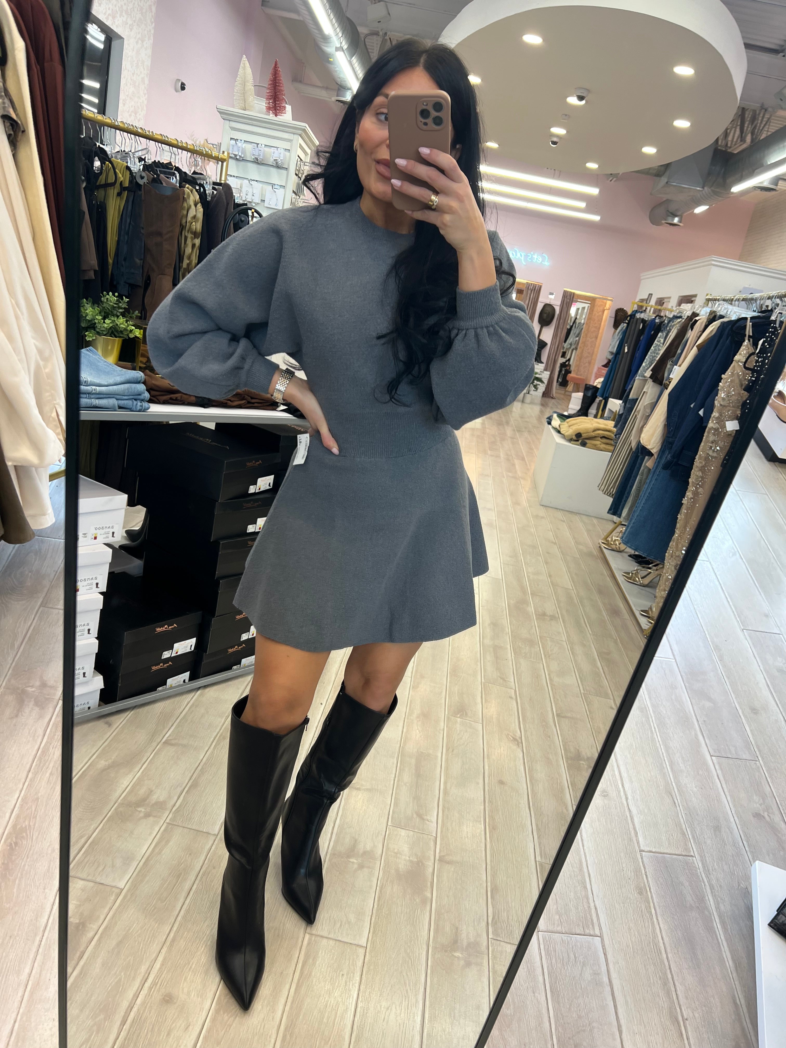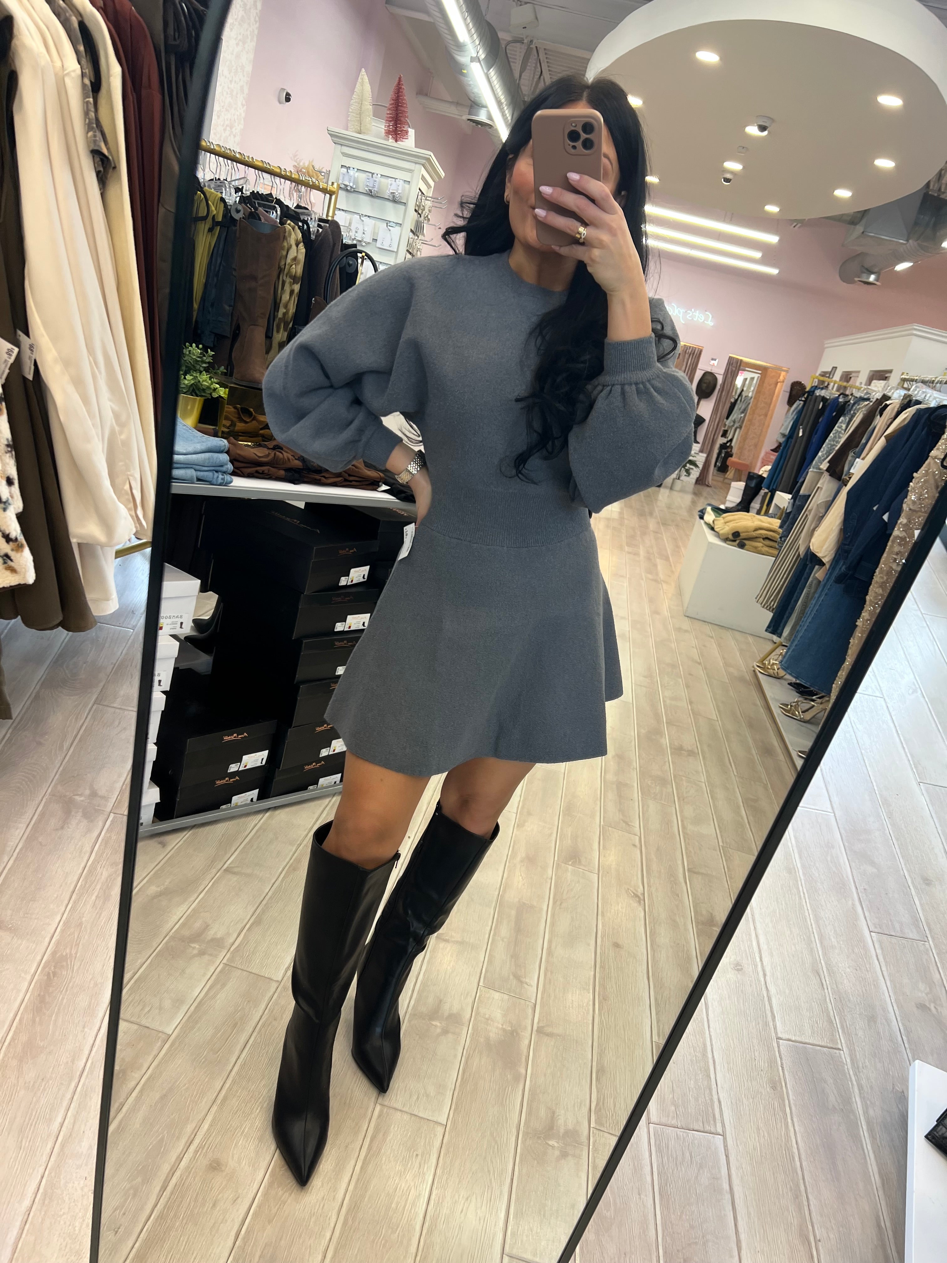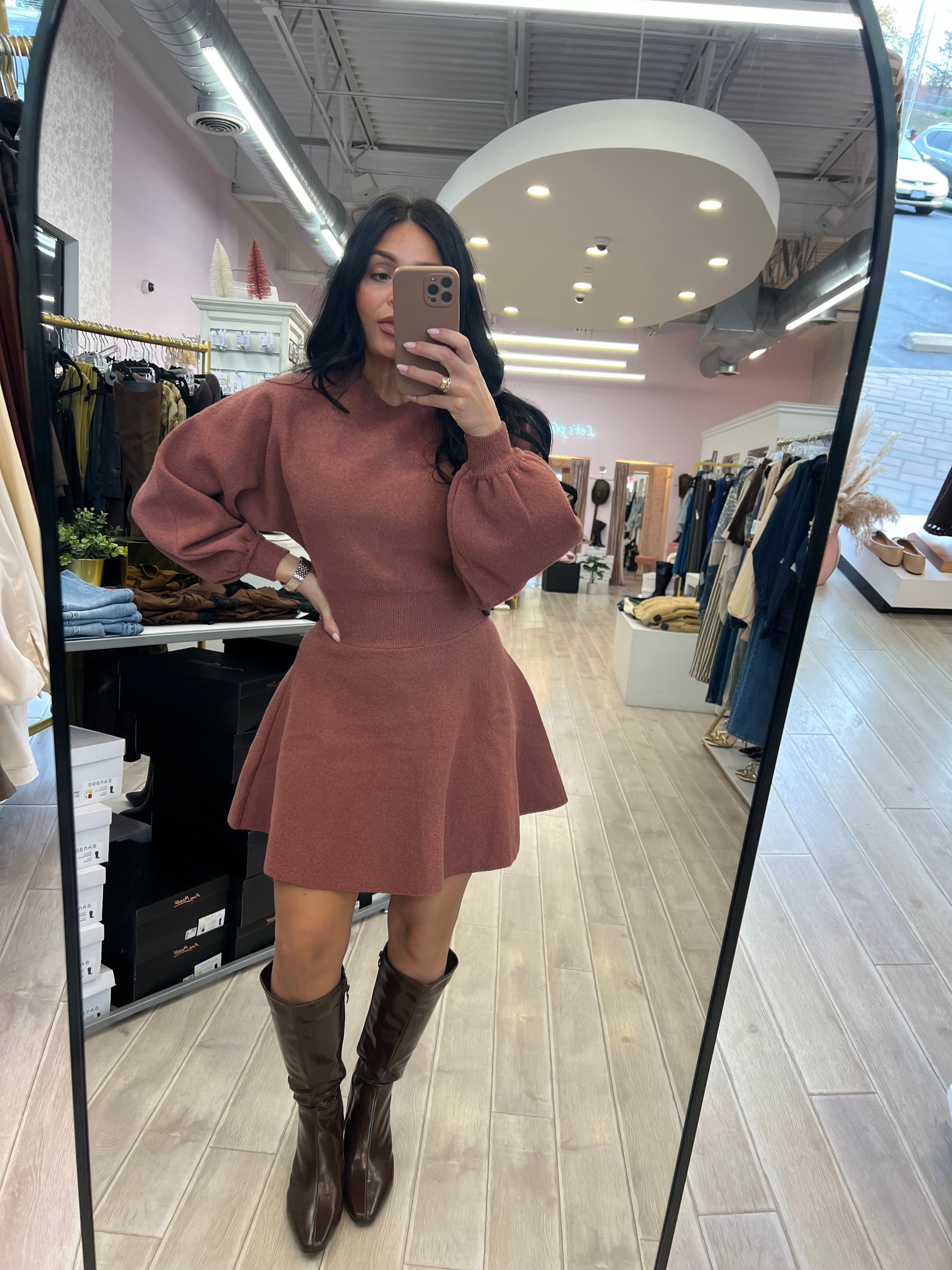 This cozy-meets- chic knit dress is the perfect blend of comfort and style. Featuring soft balloon sleeves, a fitted waist and a flared skirt, it creates a flattering, feminine silhouette while keeping you warm.