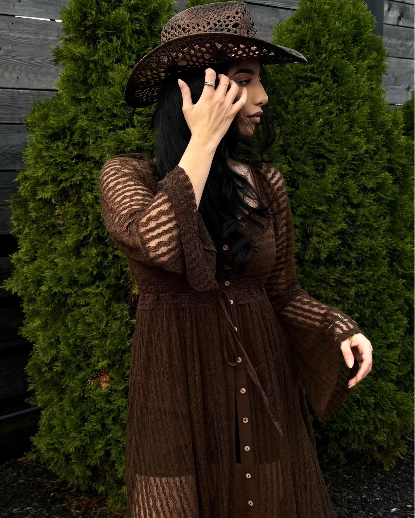 This chocolate lace duster combines feminine charm with modern details like bell sleeves. An adjustable drawstring and button closures provide the perfect fit and versatile styling. Ideal for anyone seeking a perfect piece for elegant layering.