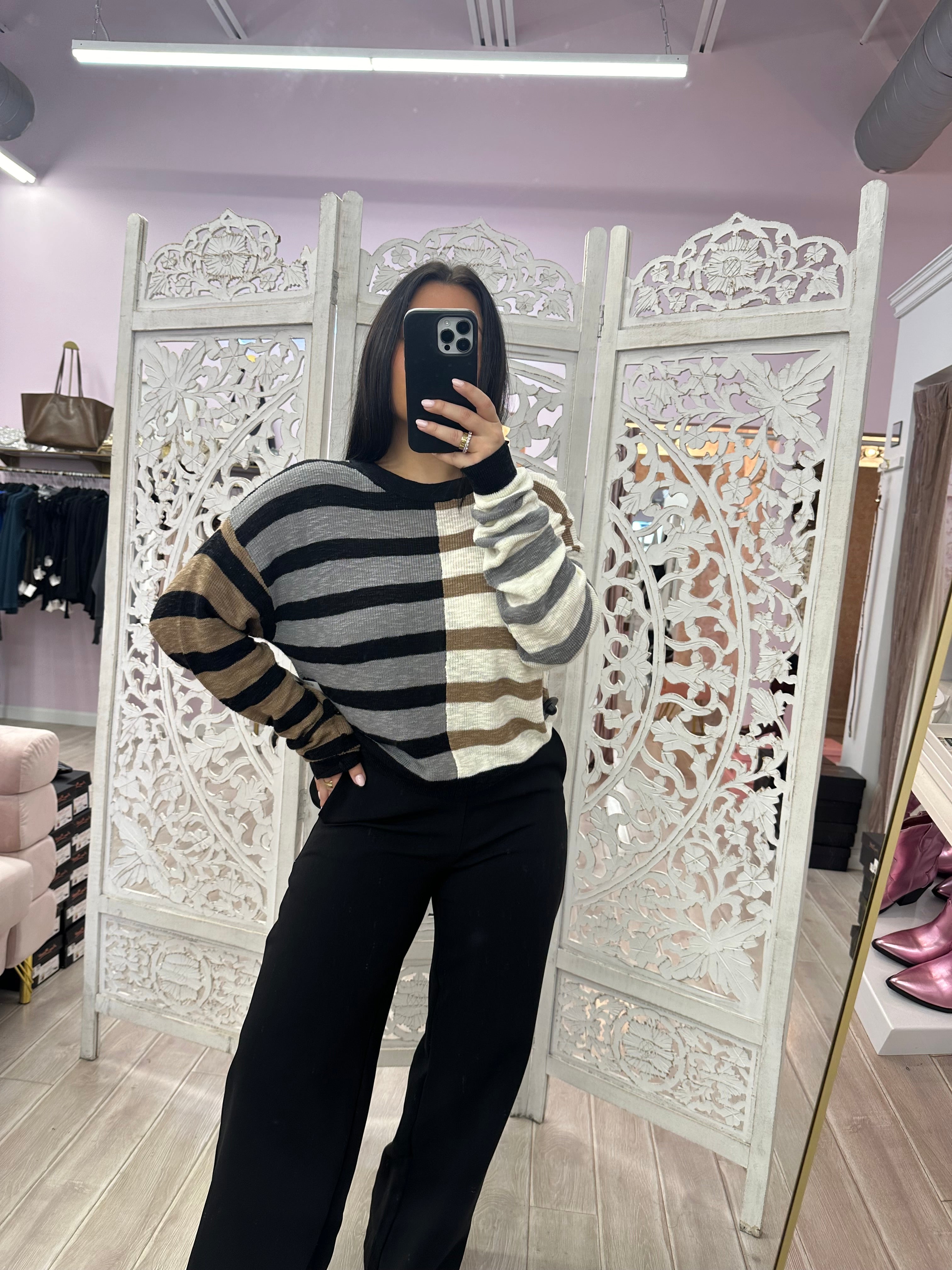 Keep it simple! This striped knit sweater with bold color contrast adds instant personality to your wardrobe. Cozy, versatile, and ready to become your favorite layering piece!