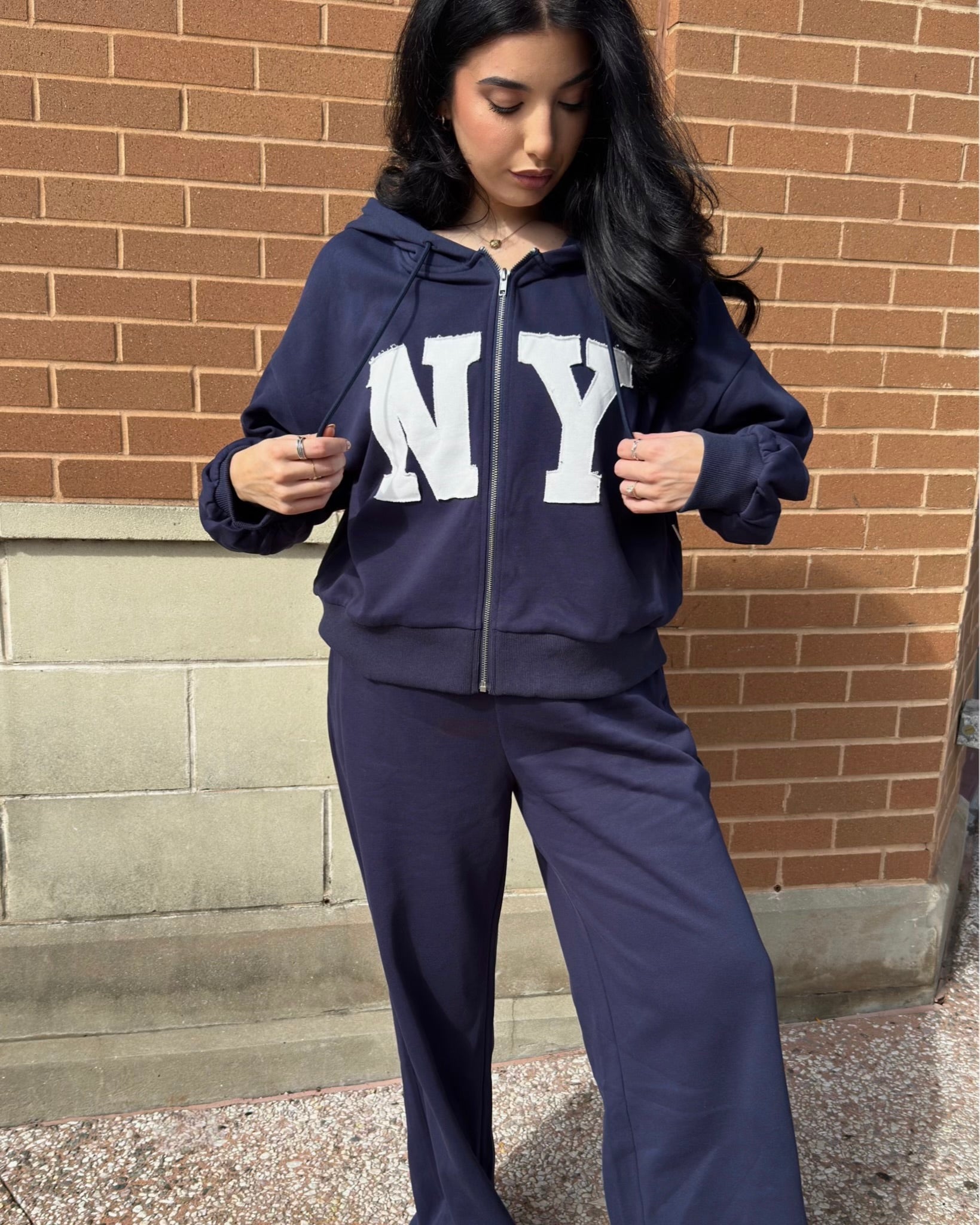 This zip-up hoodie features a stylish NY patch with raw edge detailing for a casual, edgy look. Designed with an adjustable drawstring hood and elastic hem and cuffs, it offers a comfortable, customizable fit. Available as a coordinated set, it’s a versatile addition to your wardrobe for effortless style and comfort.