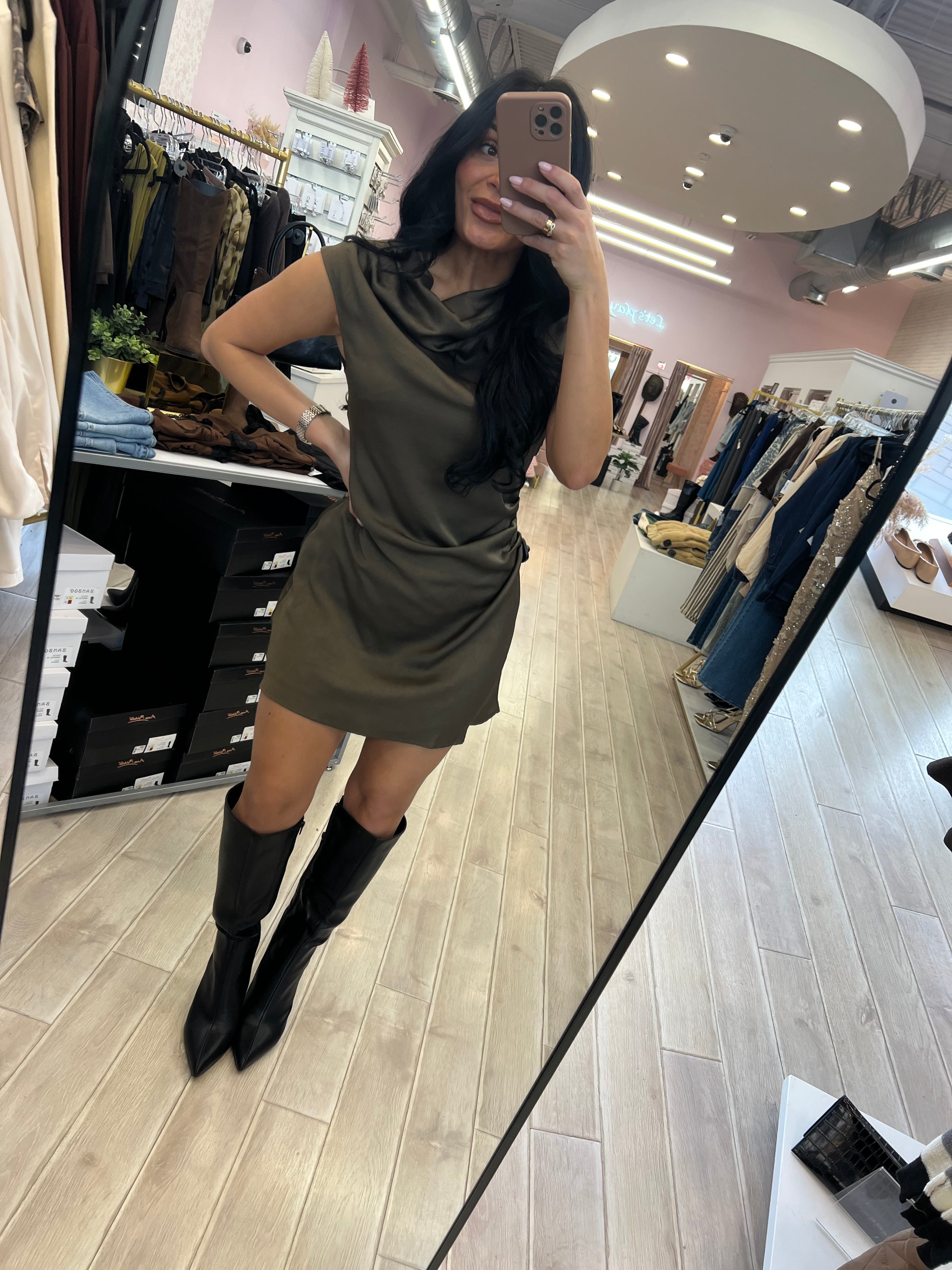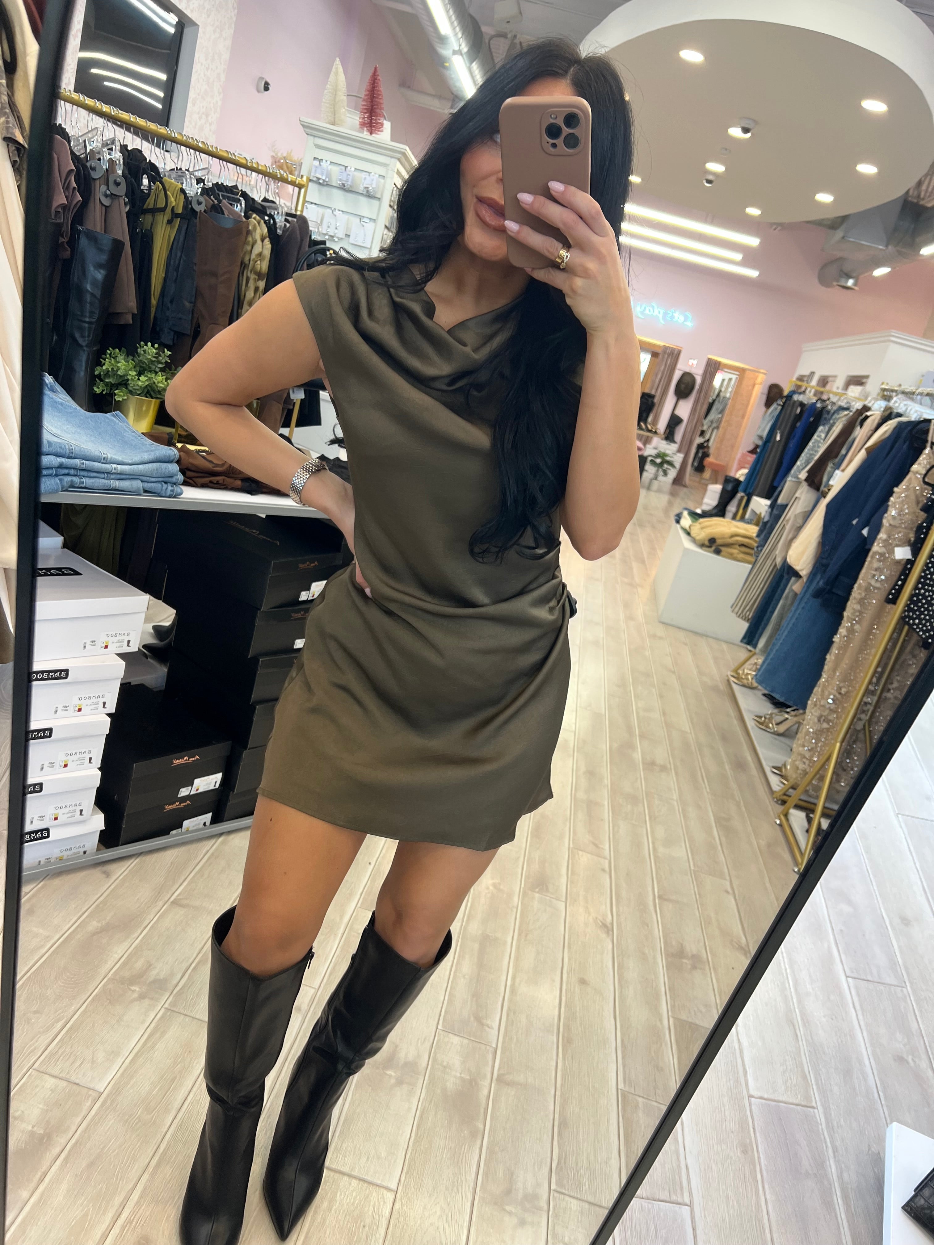 This sleek, olive-toned mini dress brings effortless sophistication with its soft draped neckline and smooth tailored silhouette. Perfect for day-to-night styling.