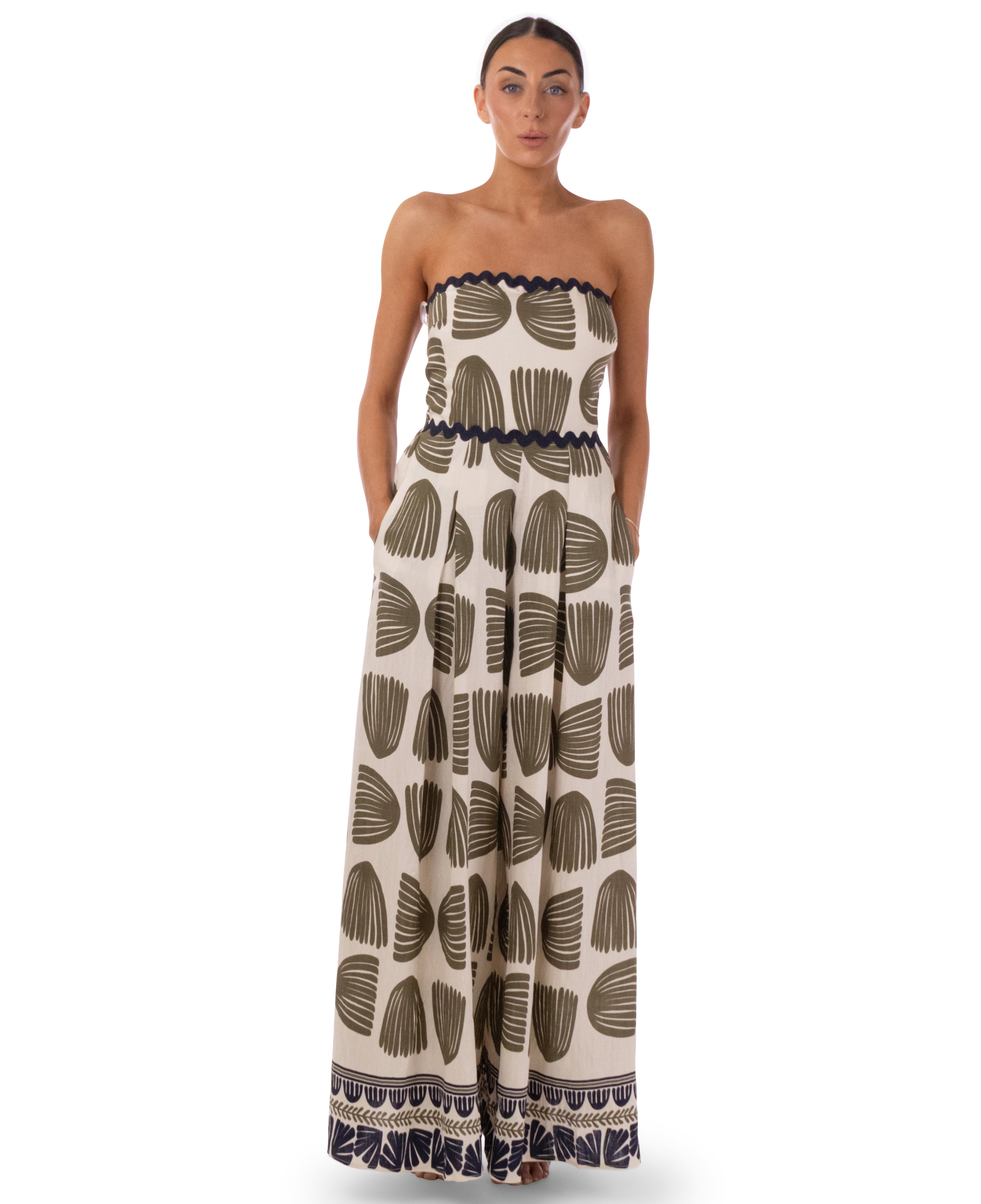 - Cream jumpsuit with dark green leaf print