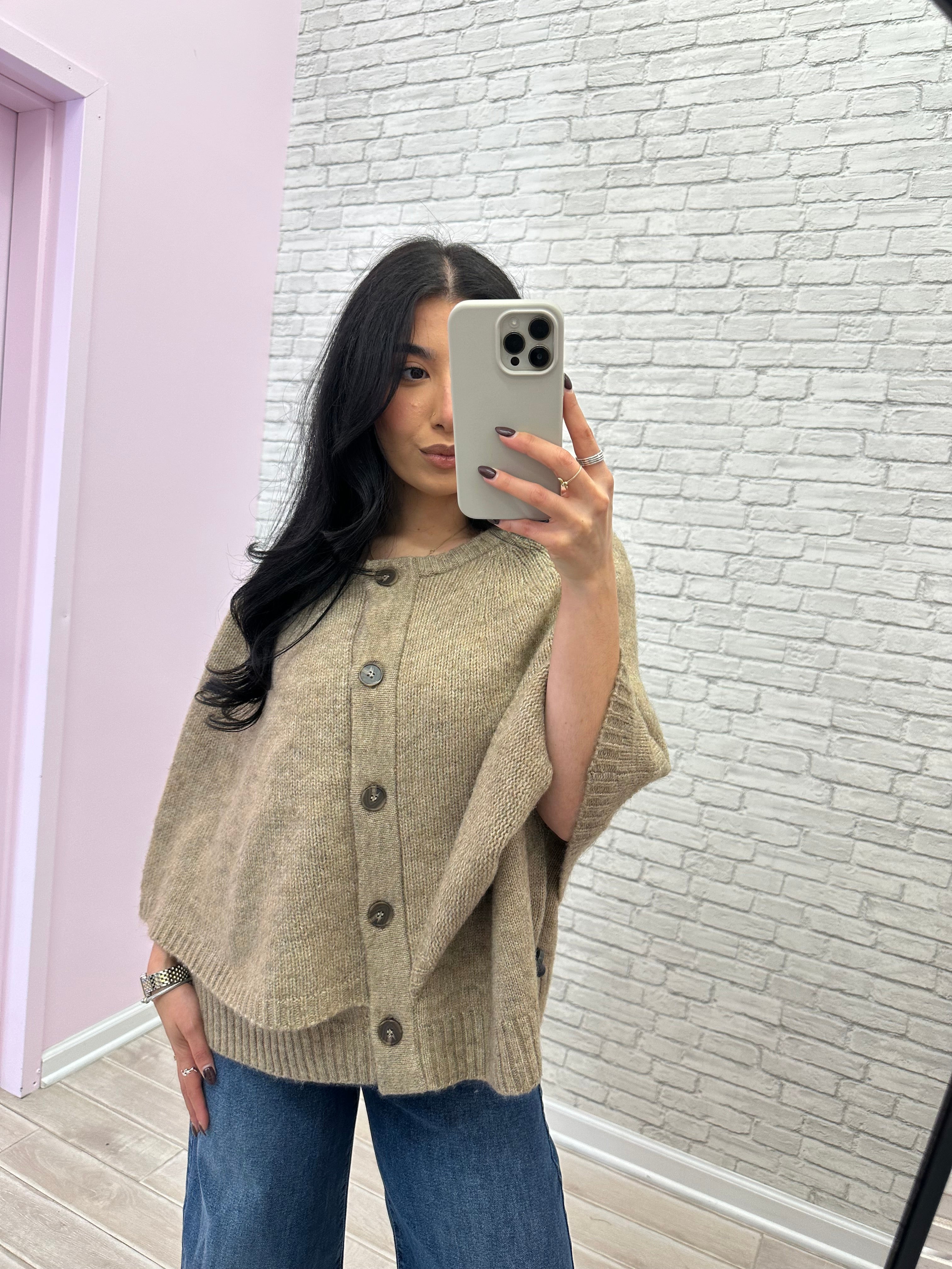 - Sleeveless wool sweater with attached shawl