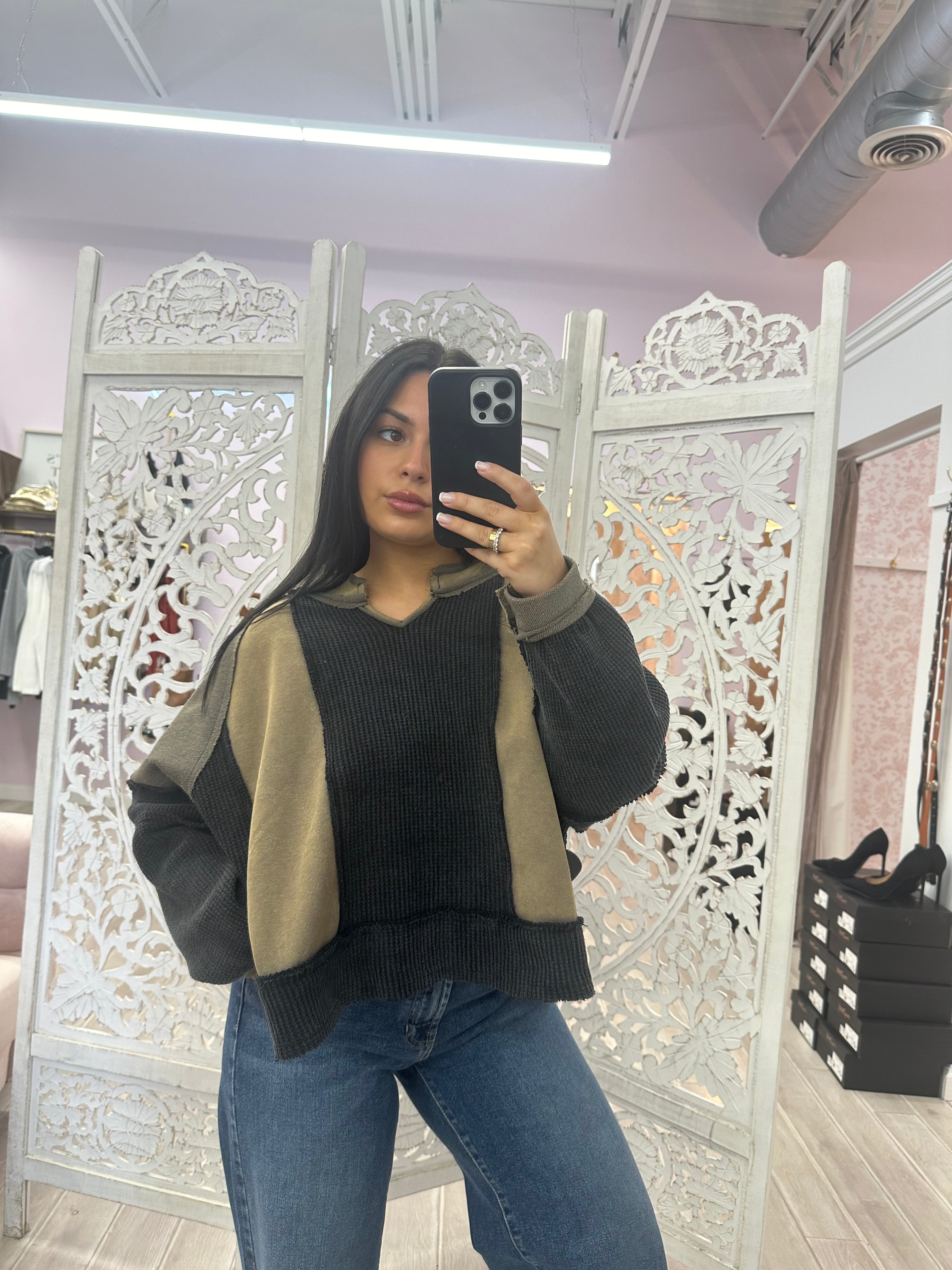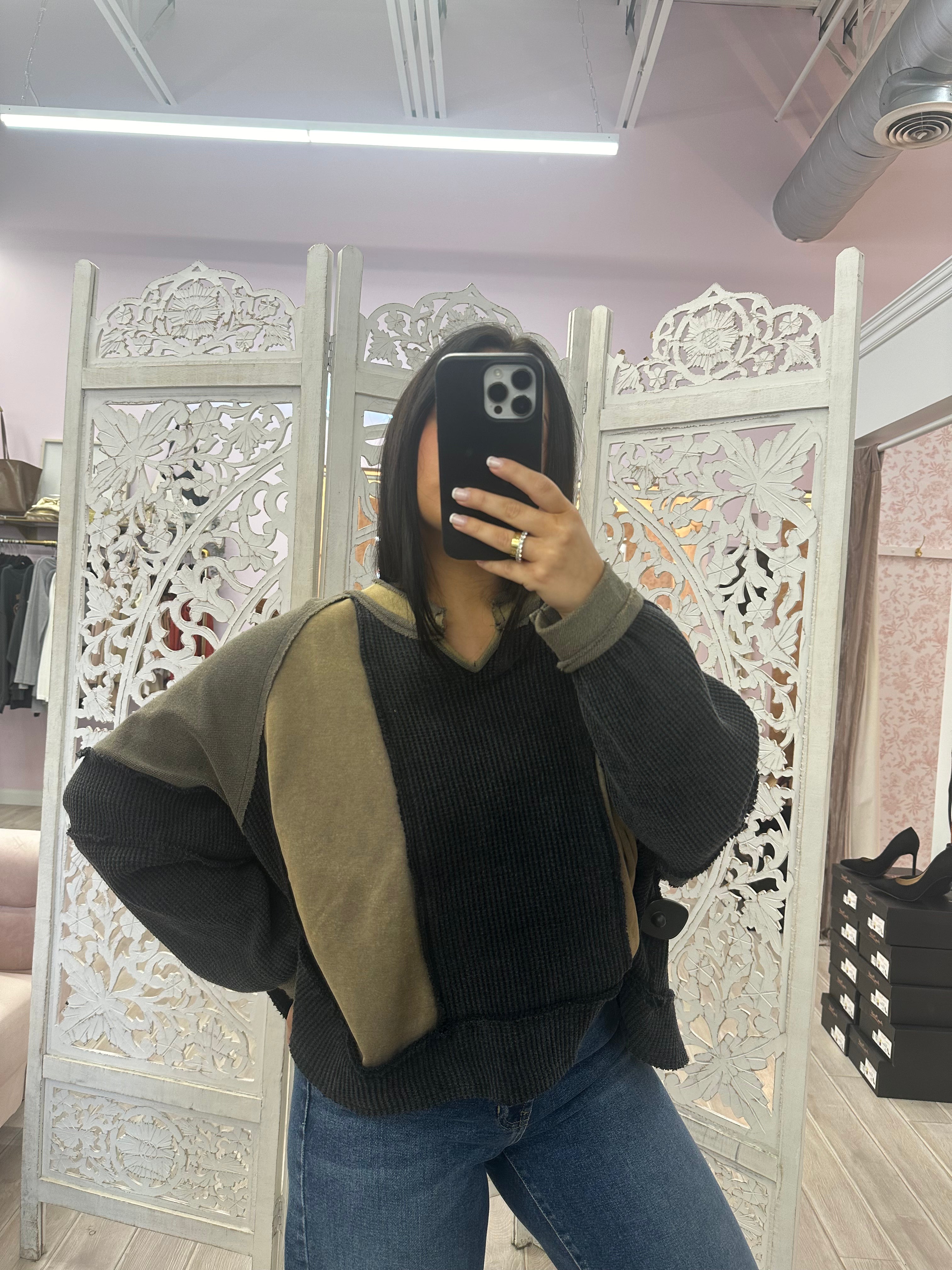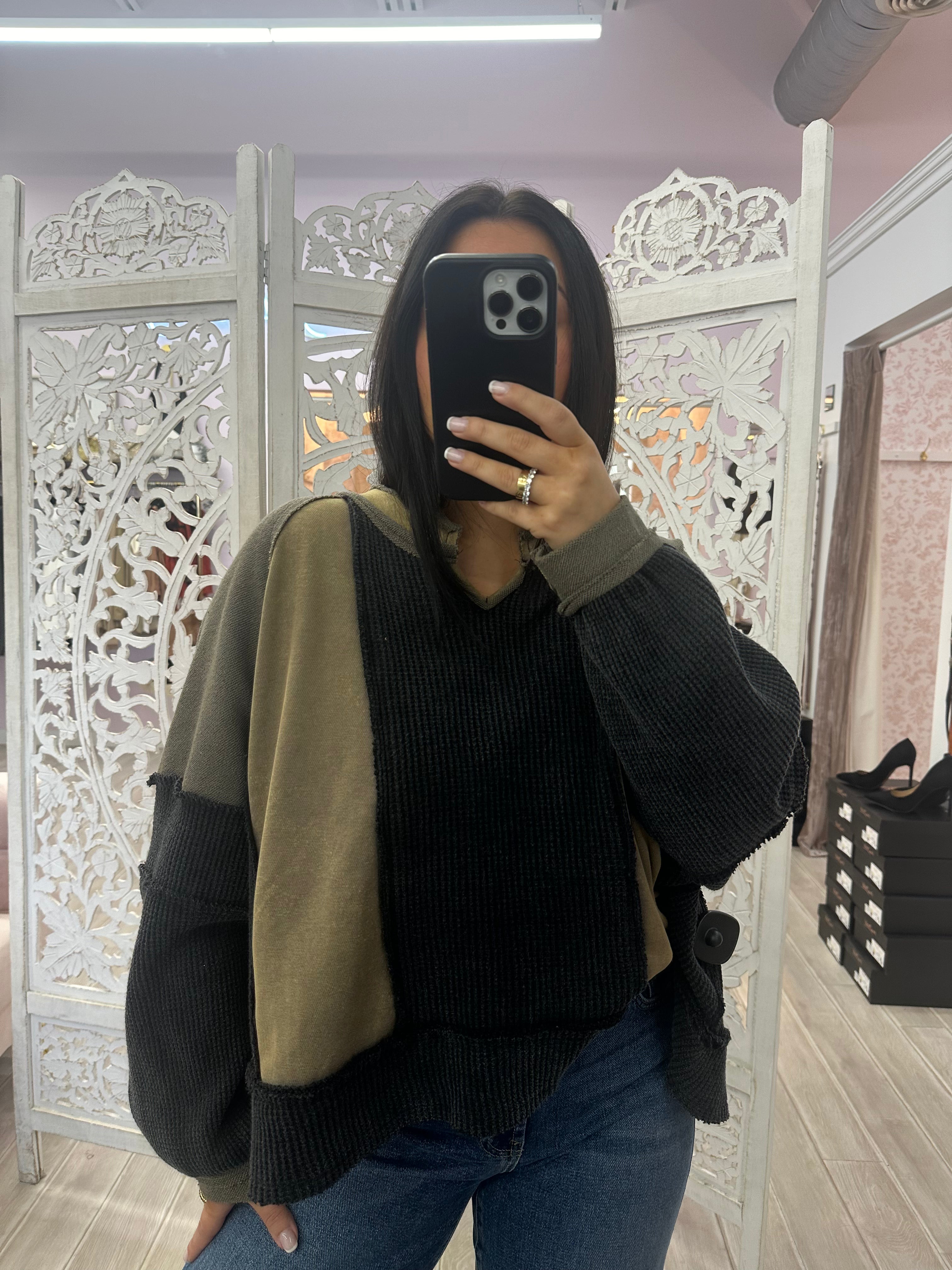 Cozy up in this oversized waffle-knit patchwork sweatshirt that's effortlessly comfy and cool. Reverse stitching and raw hem details add that handcrafted edge you're after. Perfect for layering, lounging, or making a low-key statement.