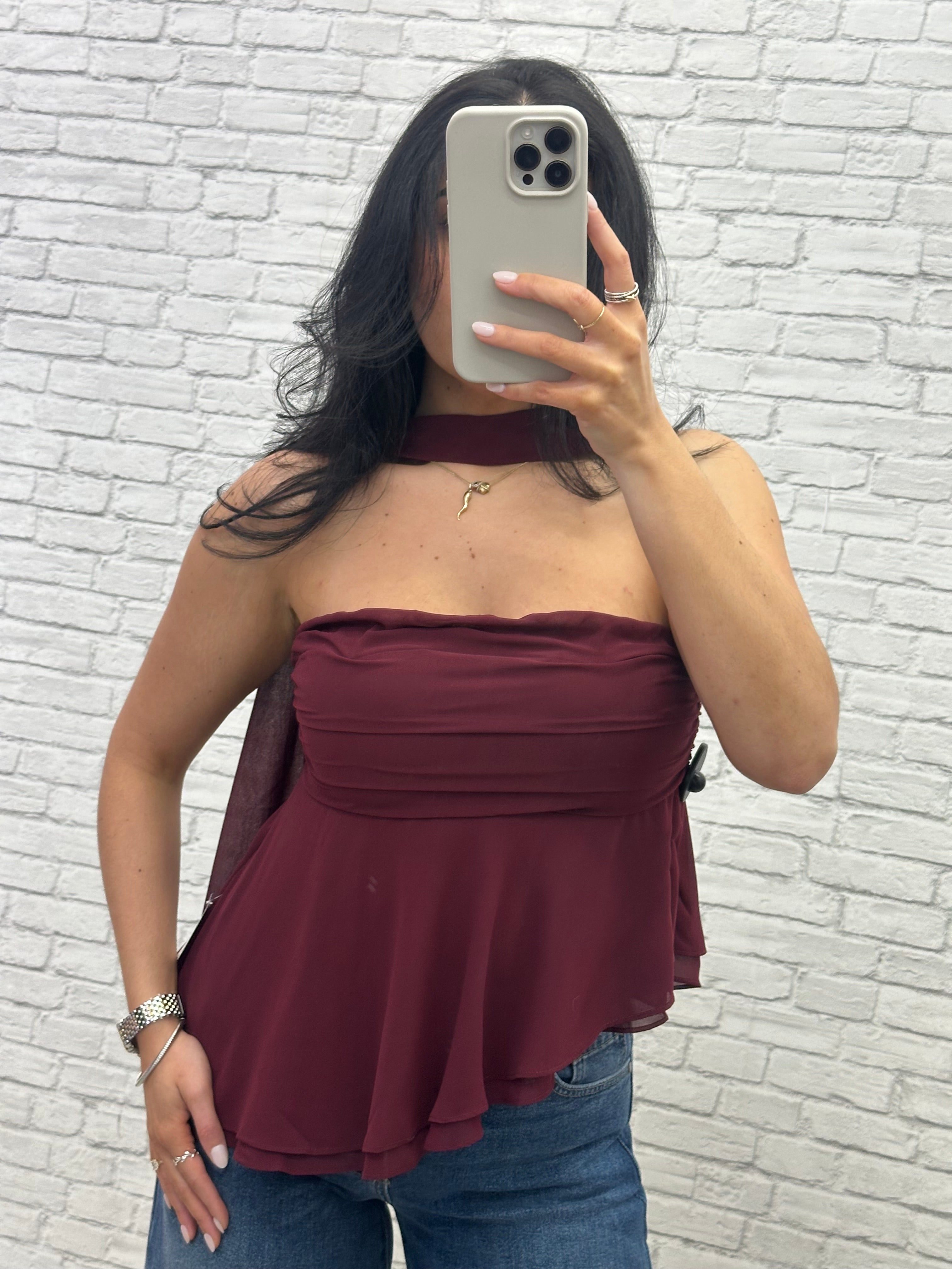 Expertly crafted from lightweight chiffon, this strapless top in a rich plum hue is the perfect addition to your wardrobe. Featuring an alluring asymmetrical hem and a separate sash accent, this top effortlessly elevates any outfit. Stay stylish and comfortable with this must-have piece.
